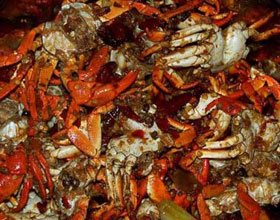 外婆飘香蟹:'1.将螃蟹洗净,剁成小块;2.青红辣椒去蒂、籽洗净,切成菱形块;3.炒锅注油烧至六成热,下入螃蟹过油,捞出控油;4.炒锅留底油烧热,放入姜片、青红辣...    详细介绍